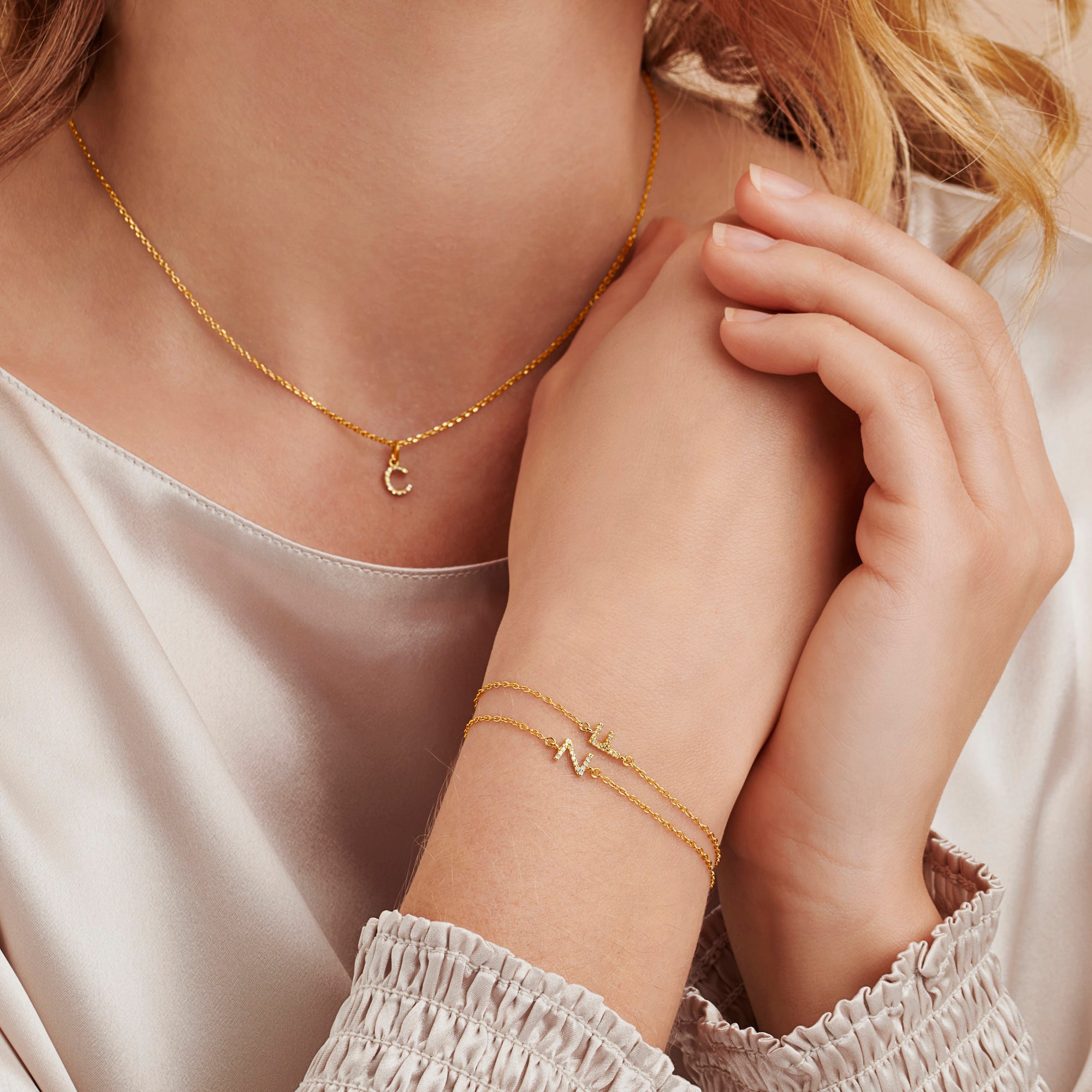 Dainty sterling silver or gold vermeil bracelets with meaningful birthstones or personalised with pavé diamond set initials.