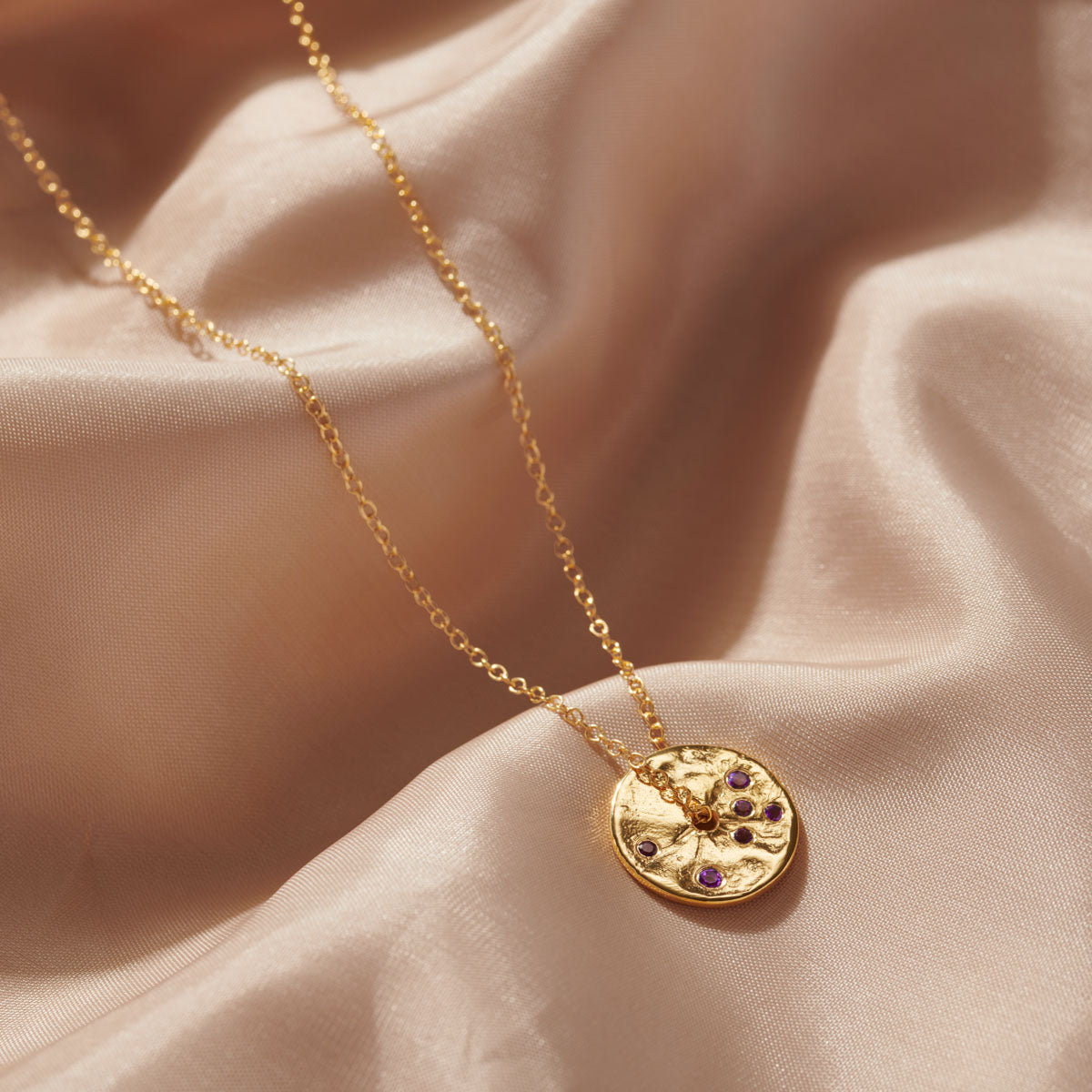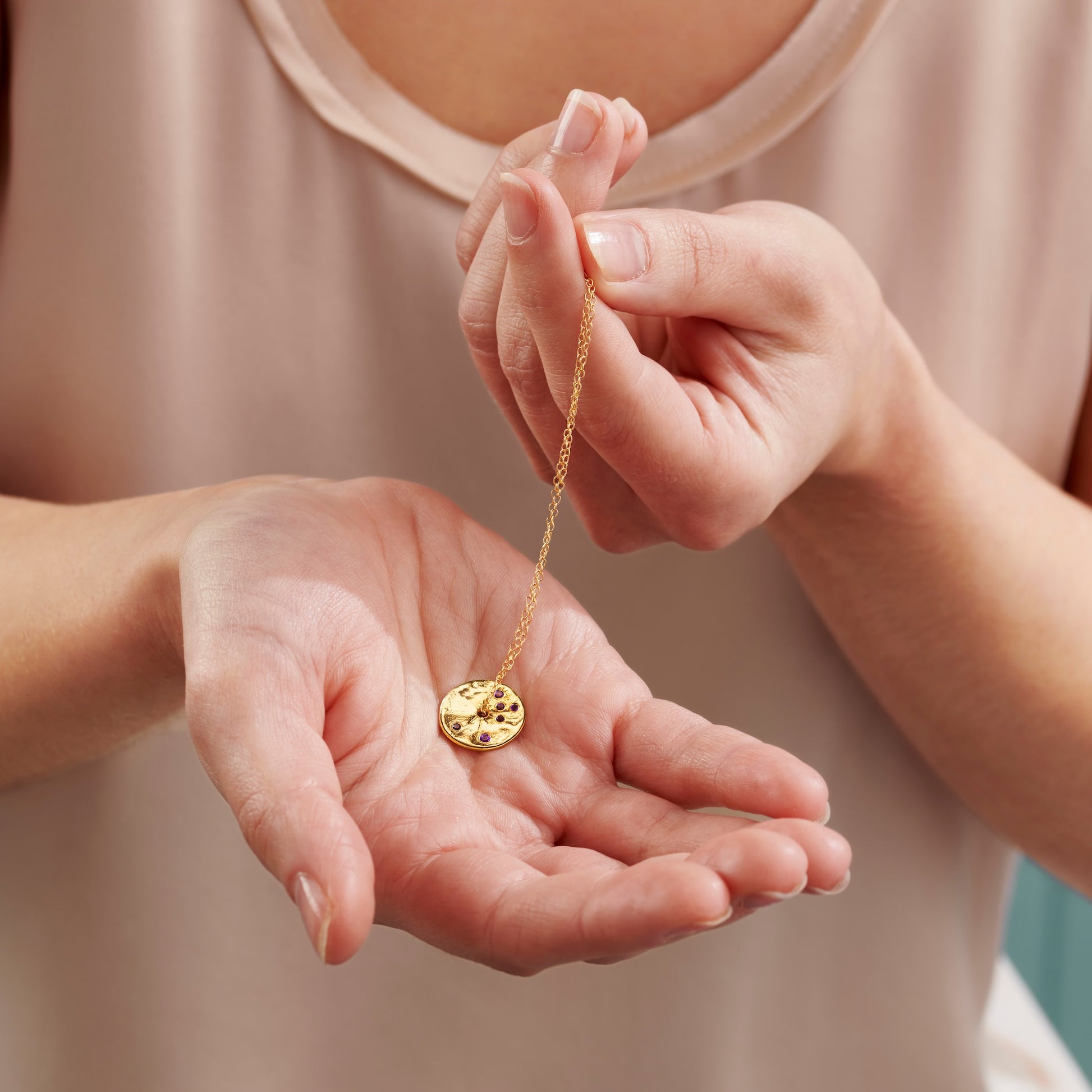 Amethyst birthstone spinner neckace in gold vermeil dotted with sparkling dark deep red faceted REAL amethyst gemstones.