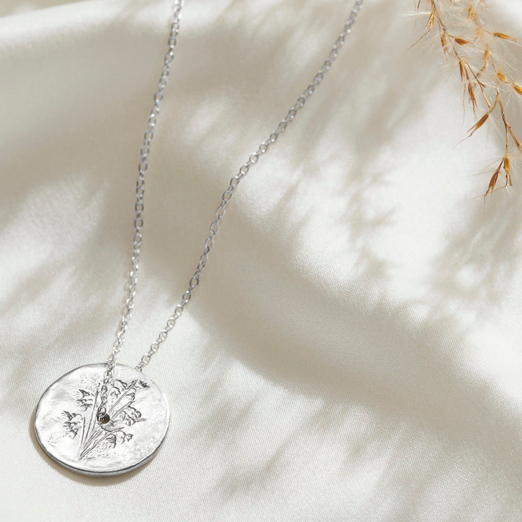 The pendant features a delicate Snowdrop flower hand engraved on sterling silver disc pendant. The circle charm has a hole in the centre of the design. A fine silver trace chain threads through the centre of the piece allowing the pendant to rotate. The pendant's surface is given a soft, organic texture, enhancing its charm and natural beauty.